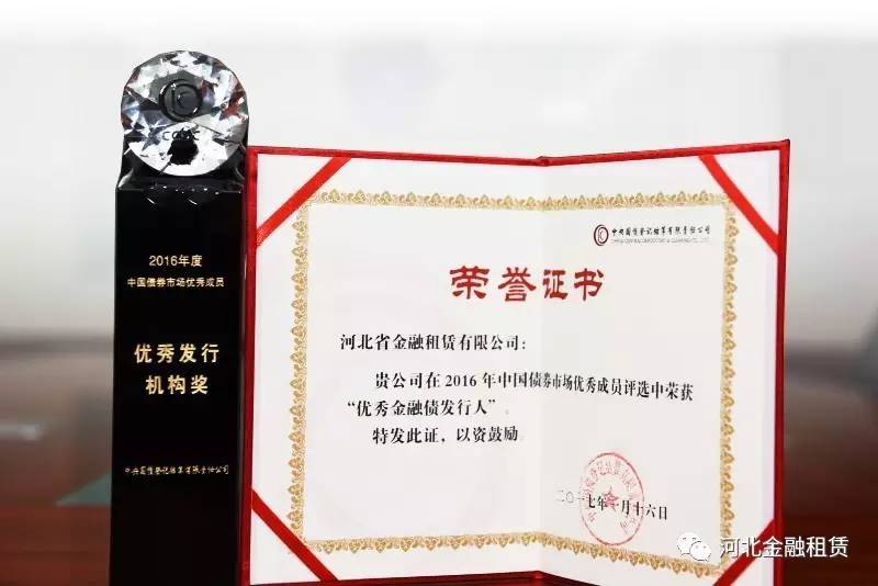 日前,中央國債登記結(jié)算有限責(zé)任公司發(fā)布2016年度中國債券市場優(yōu)秀成員評選結(jié)果,河北省金融租賃有限公司被評為“2016年度全國金融債優(yōu)秀發(fā)行人”,進一步彰顯了河北金租的品牌和市場影響力。
