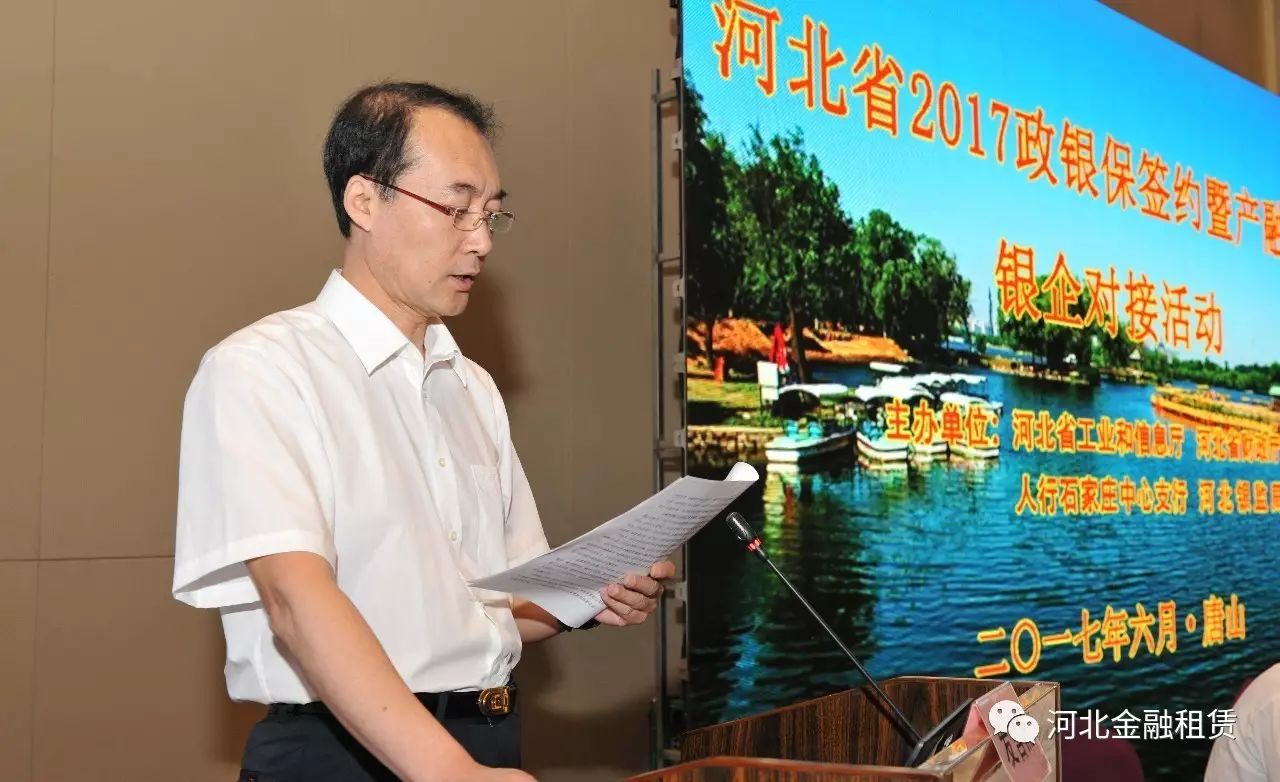 日前,河北省2017政銀保合作簽約暨產(chǎn)融合作銀企對接活動在國家產(chǎn)融合作試點城市唐山市舉行。本次活動由河北省工業(yè)和信息化廳、省財政廳、人行石家莊中心支行、河北銀監(jiān)局聯(lián)合主辦,河北省金融租賃有限公司(以下簡稱河北金租)受邀參加本次活動。