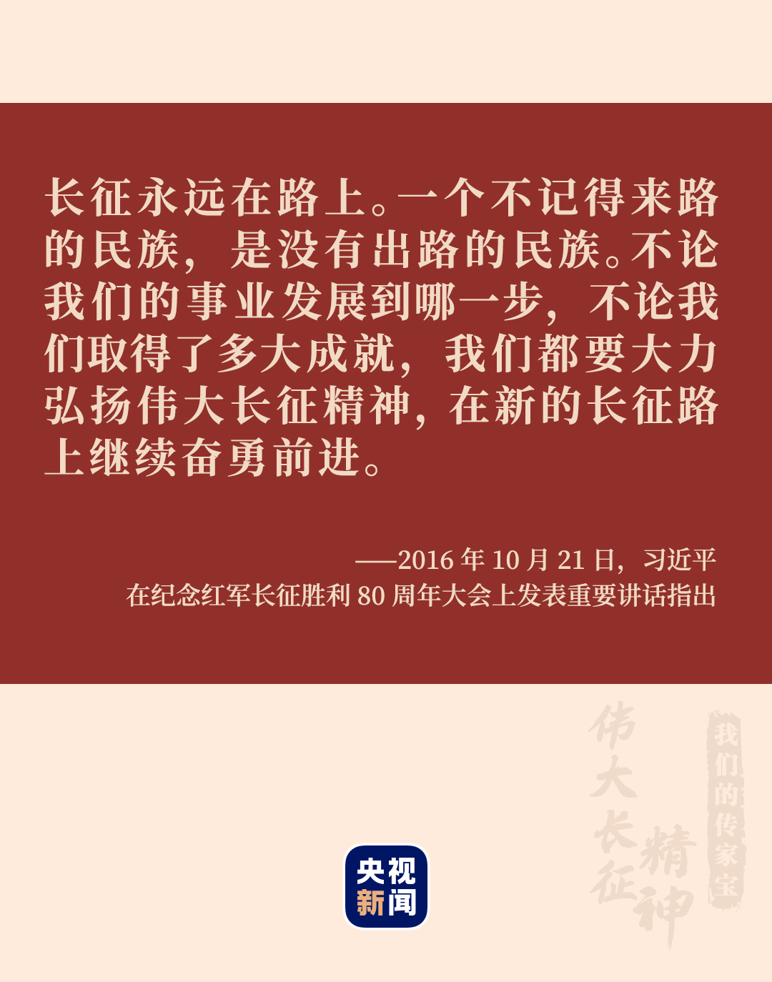 精神所在,就是血脈所在,就是力量所在。一個時代有一個時代的主題,一代人有一代人的使命。新長征路上,我們每一個中國人都要弘揚偉大的長征精神。