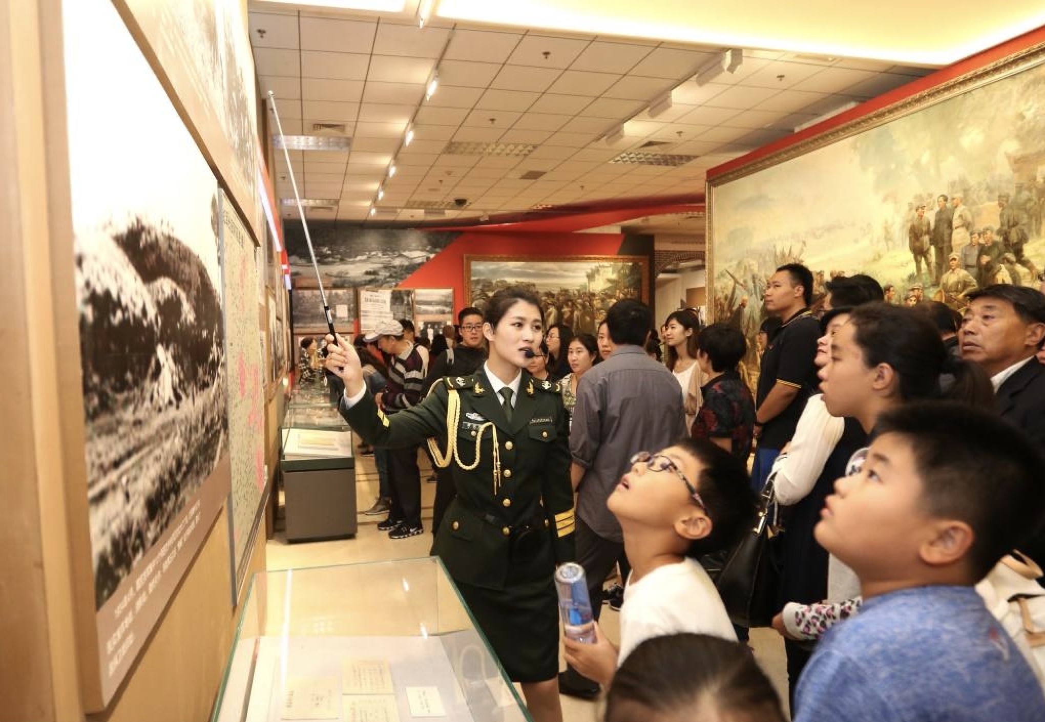 北京中國人民革命軍事博物館開放“英雄史詩 不朽豐碑——紀念中國工農(nóng)紅軍長征勝利80周年主題展覽”,解說員在為參觀者講解。