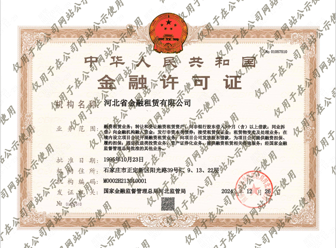 根據(jù)《國家金融監(jiān)督管理總局辦公室關(guān)于加強(qiáng)銀行保險機(jī)構(gòu)許可證管理的通知》(金辦便函〔2023〕515號)文件要求,河北省金融租賃有限公司于2024年12月26日換領(lǐng)新《中華人民共和國金融許可證》,現(xiàn)予以公示。