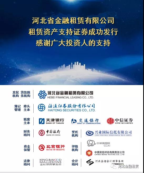 日前,河北省金融租賃有限公司(以下簡稱“河北金租”)冀租穩(wěn)健2020年第一期租賃資產支持證券在銀行間債券市場成功簿記建檔發(fā)行,獲得了交通銀行、中國銀行等大型國有銀行及其他各類銀行的踴躍認購,合計金額15.65億元。