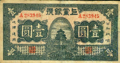1938年,為了獨立自主地發(fā)展和鞏固根據地,嚴防蔣介石、閻錫山經濟封鎖,晉東南抗日根據地在沁縣成立上黨銀號,發(fā)行“上黨票”。上黨票初發(fā)行時與法幣、晉鈔、銀元以及根據地各縣銀號發(fā)行的縣票同時流通于晉東南、晉南、晉中、冀南等部分縣域,1938年發(fā)行的面額有拾元、伍元、貳元、壹元、伍角、貳角伍分、貳角、壹角等8種票面10種版別。壹元票的主圖設計為體現根據地貨幣特色,天壇主圖的下面倒印有一“黨”字暗記。1940年初,“上黨銀號”結束,其財產并入“冀南銀行”時,共發(fā)行上黨票300余萬元。
