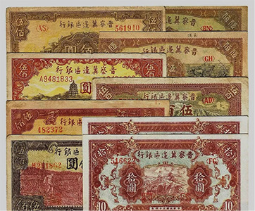 晉察冀抗日根據地,是中國共產黨在抗日戰(zhàn)爭時期于敵后開創(chuàng)的第一個抗日根據地。晉察冀邊區(qū)政府于1938年2月成立晉察冀邊區(qū)銀行,在山西五臺縣石咀鄉(xiāng)的普濟寺內開始營業(yè)。邊區(qū)銀行的貨幣發(fā)行后,清除了地方發(fā)行的各種鈔票,統一了邊區(qū)的貨幣市場,支持了抗日戰(zhàn)爭,支持了生產,改善了人民生活,深受抗日根據地軍民的歡迎。晉察冀邊區(qū)票當時在山西、河北、察哈爾省、熱河省以及遼寧西部、內蒙古、山東德州地區(qū)等敵后抗日根據地流通,流通人口達3000多萬人。直到1948年晉察冀邊區(qū)銀行與冀南銀行合并,成立華北銀行,晉察冀邊區(qū)票才停止流通使用。