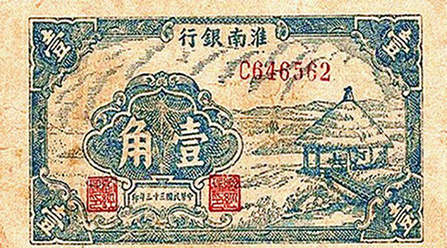 淮南銀行1942年成立,行址設于江蘇淮安盱眙縣,發(fā)行淮南幣通行于淮南地區(qū)各縣。1945年8月與淮北地方銀號、江淮銀行、鹽阜銀行、淮海銀行4個地方銀行合并組成華中銀行。