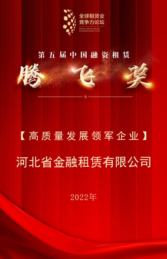 日前,第九屆全球租賃業(yè)競爭力論壇年度峰會圓滿召開,河北省金融租賃有限公司(以下簡稱“河北金租”或“公司”)再度攬下中國融資租賃“騰飛獎”,榮獲“高質(zhì)量發(fā)展領軍企業(yè)”榮譽。